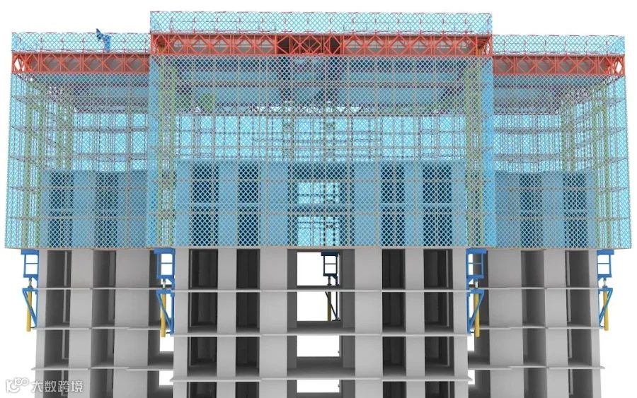 平台可同时覆盖5~8个结构层,把施工所需的操作架、模板、工机具、配电箱等合理布设于平台内,随平台整体同步顶升,减少物料周转,实现外立面的结构、砌体、保温、抗裂砂浆、腻子、栏杆、门窗、外墙装饰等多工序高效立体流水化作业,为服务精益建造提供更大空间。未来将考虑集成小型钢筋加工场等施工设施,进一步提高施工效率。