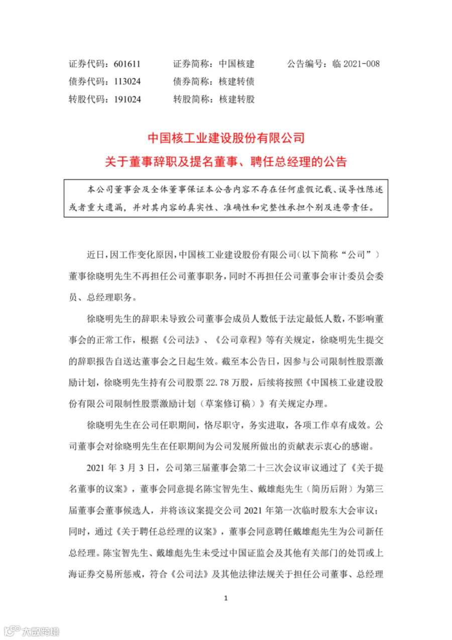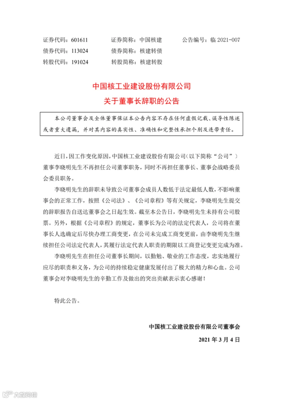 根据中国核建官网公告,该公司领导班子近日做出了巨大调整: