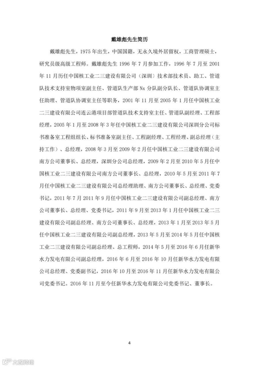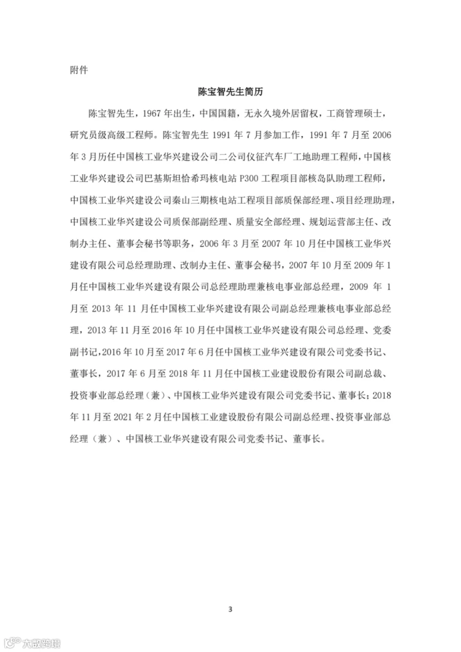 原中核华兴董事长陈宝智任中国核建董事长,新华水力发电董事长戴雄彪任总经理。