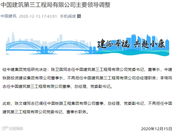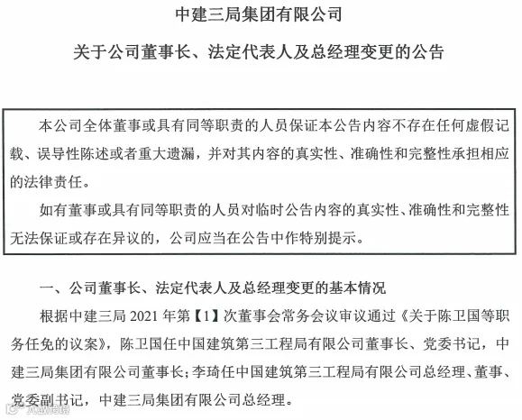 3月3日,中建三局集团发布关于公司董事长、法定代表人、总经理变更的公告,公告显示:根据中建三局2021年第1次董事会常务会议审议通过《关于陈卫国等职务任免的议案》,