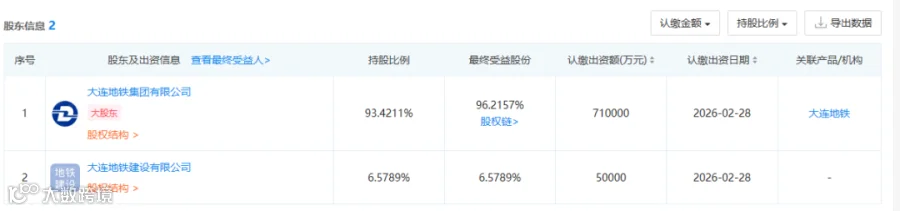 企查查股权穿透显示,该公司共有股东2名,其中大连地铁集团有限公司认缴出资额:710000 万元,持股比例93.4211% ,大连地铁建设有限公司认缴出资额:50000 万元,持股比例6.5789% 。