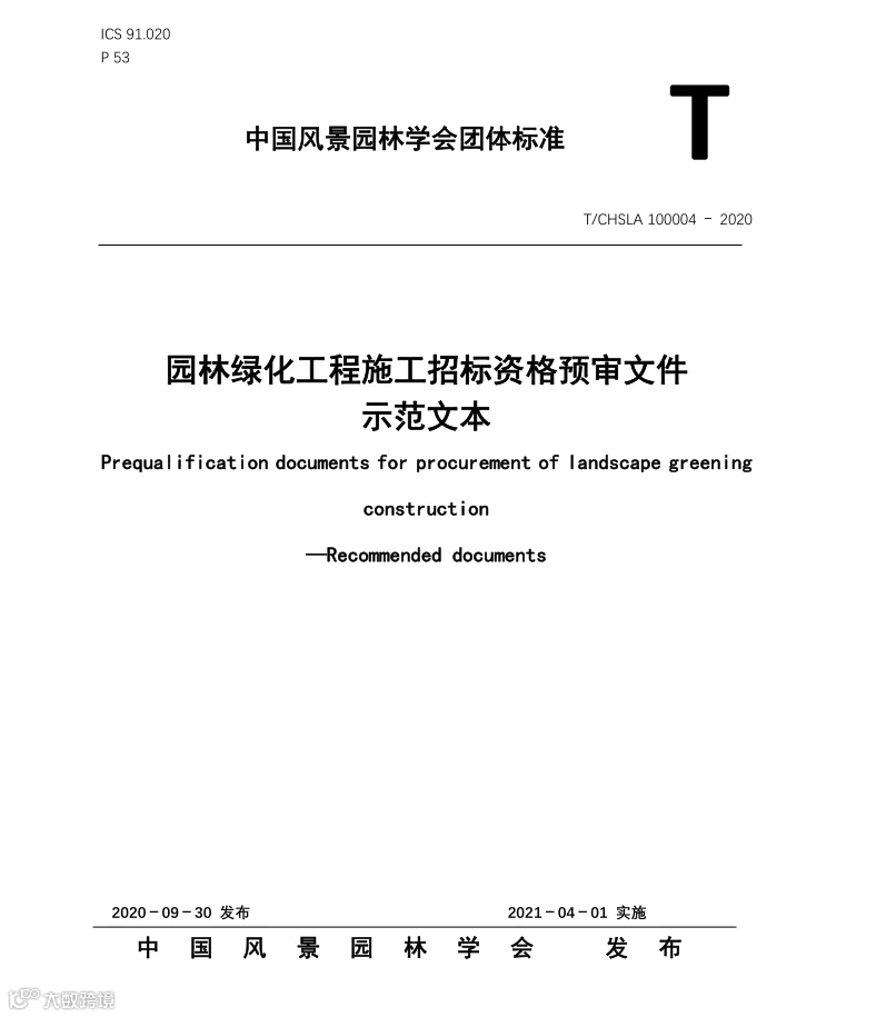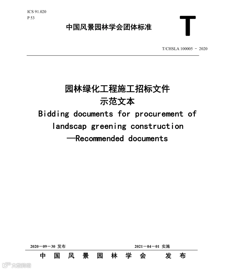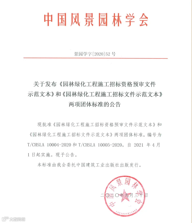 二○二○年九月,《园林绿化工程施工招标资格预审文件示范文本》和《园林绿化工程施工招标文件示范文本》两项团体标准发布,2021年4月1日起实施。
