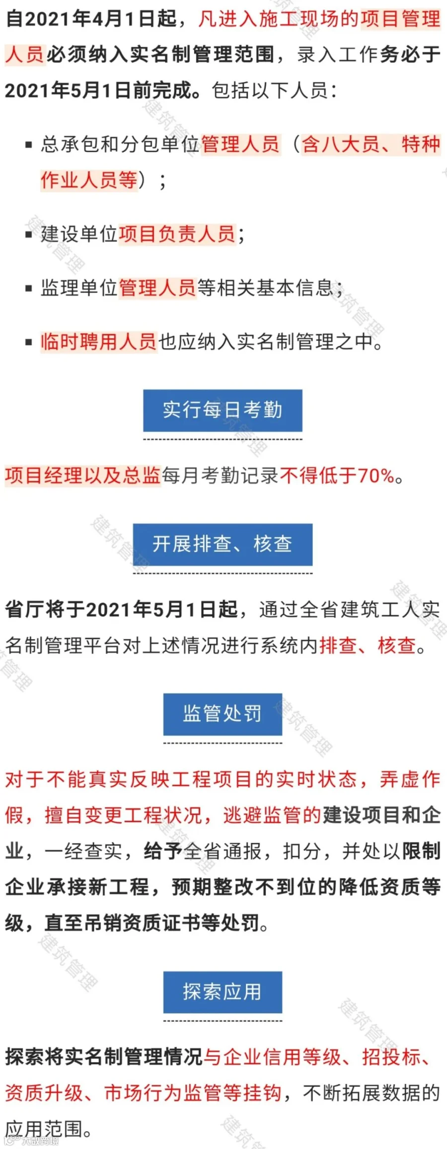各地住房城乡建设主管部门要加强本行政区域内房屋建筑和市场基础设施项目实名制管理工作监管力度,拓展实名制人员信息录入的范围。自2021年4月1日起,凡进入施工现场的建设单位、总包单位、分包单位、监理单位、劳务企业的项目管理人员必须纳入实名制管理范围,包括总承包和分包单位管理人员(含八大员、特种作业人员等)、建设单位项目负责人员、监理单位管理人员等相关基本信息(包括相关持证上岗人员的证书类别、证书编号、有效期等);应及时修改完善建筑工人的技能等级、联系方式、银行帐号等信息,对于临时聘用人员也应纳入实名制管理之中,做到应录尽录、准确无误,相关信息完善、录入工作务必于2021年5月1日前完成。全省房屋建筑和市场基础设施项目要严格按照实名制管理要求,实行每日考勤,考勤记录将作为各地对建筑市场行为监管以及核实管理人员是否履职的重要依据,其中项目经理以及总监每月考勤记录不得低于70%。对于未按要求执行的项目,省厅将纳入预警项目清单,逾期未改正的将予以通报、处罚并扣除项目和企业对应的信用分。有条件的地区可以将本地建筑市场执法人员信息一并录入,方便执法和监管人员对项目实名制管理落实情况的督导检查,执法监督数据一并纳入实名制管理之中。