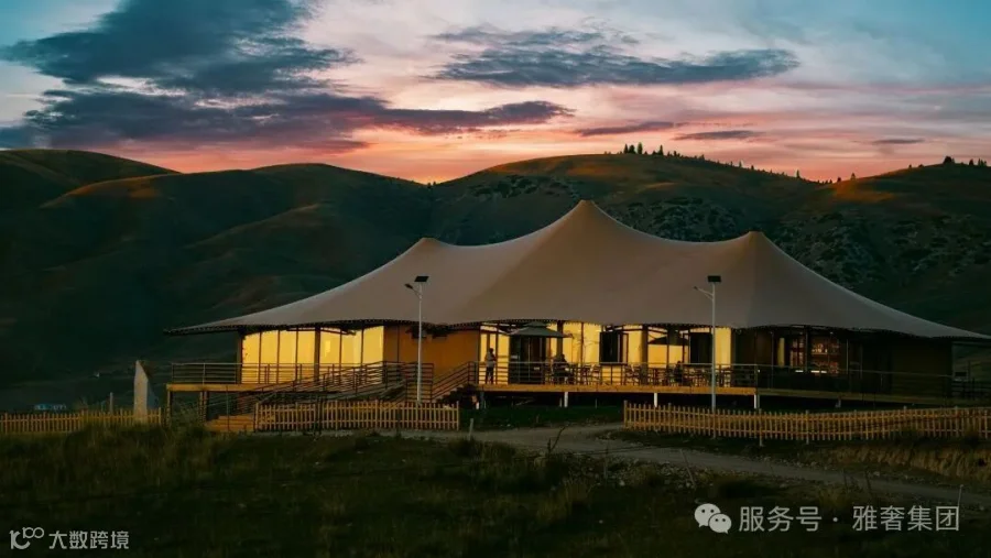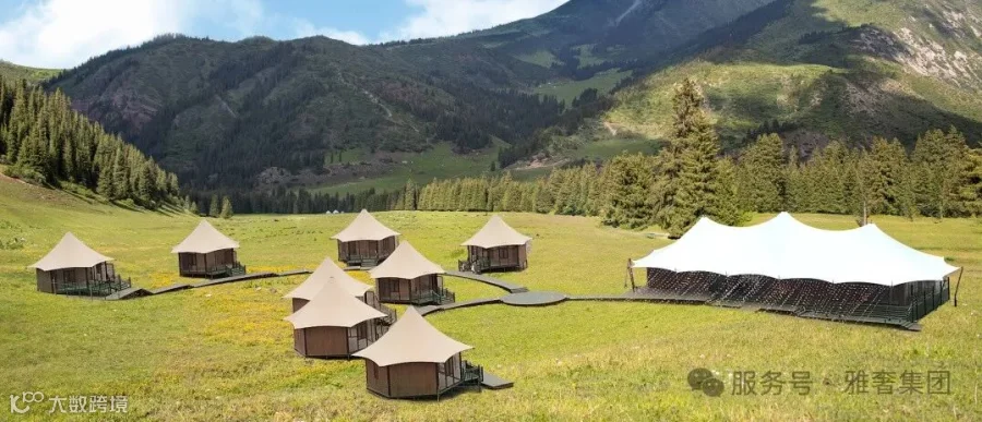 功能区域定制:雅奢可根据客户对营地的使用定位和游客流量,对土地进行科学设计,规划出住宿区、餐饮区、休闲娱乐区、活动区等不同功能区域。如新疆无垠之境野奢营地,便是顺应草原坡度特征,科学布局居住及餐饮两大功能区,居住采用 Z30酒店帐篷系列,餐饮采用 Z 款三峰定制款。