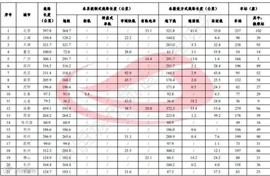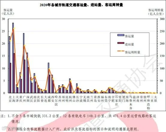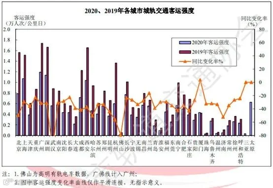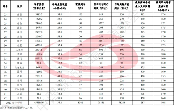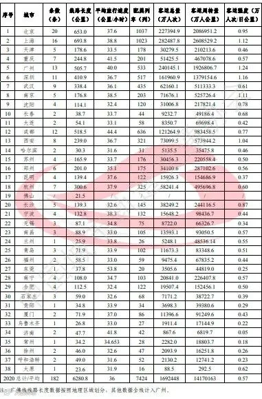 从线网来看,全制式综合线网平均客运强度超过1万人次/公里日的有4个城市,依次为广州1.2万人次/公里日、深圳1.1万人次/公里日、上海1.0万人次/公里日、西安1.0万人次/公里日。