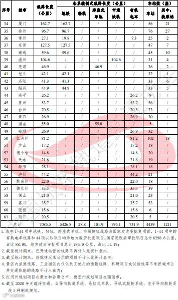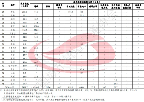 截至2020年底,共有45个城市开通城轨交通运营线路244条,运营线路总长度达7969.7公里。新增天水、三亚、太原3市,其中,天水、三亚为有轨电车。另依据2020年11月1日生效的团体标准《城市轨道交通分类》(T/CAMET 00001-2020)相关规定,将2018年开通运营的株洲A1线和2019年开通运营的宜宾T1线(均为电子导向胶轮系统)纳入统计,城轨交通运营城市累计达45个。