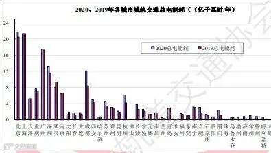图16 2020、2019年各城市城轨交通总电能耗