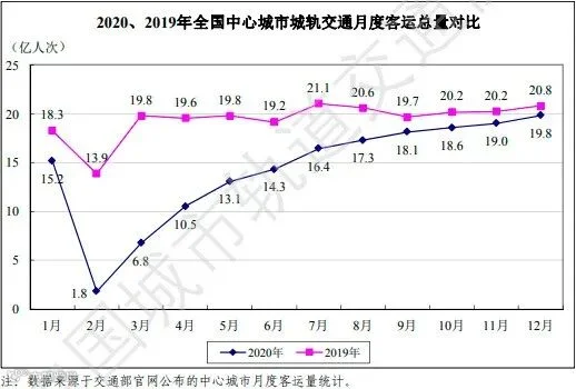 从2020年全国中心城市城轨交通月度客运量表中可以看出,2月份城轨交通客运量断崖式下跌,其后各月减幅收窄并逐渐有所恢复。2020、2019年中心城市城轨交通月度客运总量情况见图5。