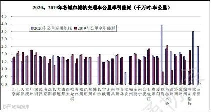 2020年,平均车公里总电能耗4.52千瓦时,比上年增长7.8%,平均车公里牵引能耗1.9千瓦时,比上年增长4.7%,各城市城轨交通单位车公里牵引能耗见图19。