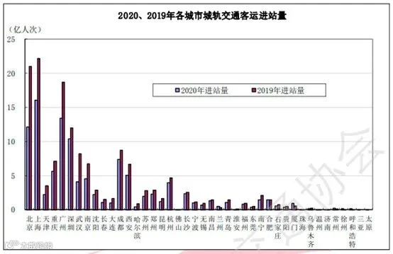 图9 2020、2019年各城市城轨交通客运进站量