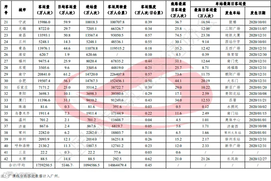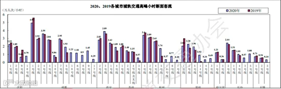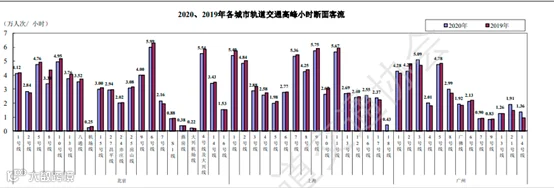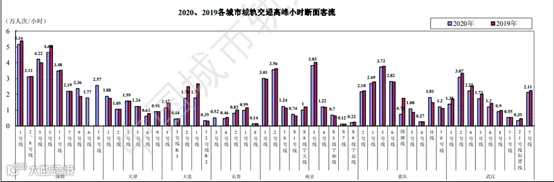 2020年,受疫情影响,客流量总体下降,但部分城市随着新线的开通,网络化运营集聚更多的通勤客流,线路高峰小时最高断面客流仍有增长的城市有:广州、深圳、成都、西安、苏州、杭州、郑州、长沙、宁波、昆明、南昌、青岛、福州、南宁、合肥、石家庄、厦门、兰州、徐州等。