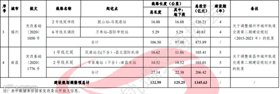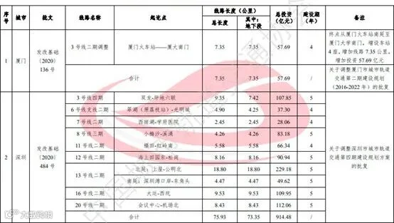 另有4市城轨交通建设规划调整方案获国家发改委批并公布,分别为厦门市城市轨道交通第二期建设规划调整方案(2016-2022年)、深圳市城市轨道交通第四期建设规划调整方案、福州市城市轨道交通第二期建设规划(2015-2021年)调整方案和南昌市城市轨道交通第二期建设规划调整方案。4市获批调整方案涉及项目新增线路长度共计132.6公里,新增总计划投资1345.6亿元。