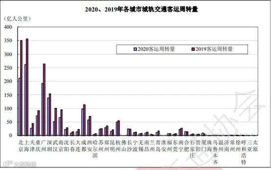 图10 2020、2019年各城市城轨交通客运周转量