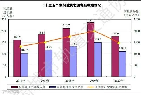 拥有4条及以上运营线路,且换乘站3座及以上的城市22个,占已开通城轨交通运营城市总数的49%。2020年全年累计完成客运量175.9亿人次,同比下降25.8%,总进站量为109.5亿人次,同比下降26.8%,总客运周转量为1486.4亿人公里,同比下降25.8%,受新冠疫情影响,一季度运营规模断崖式下降,后期逐渐恢复,与上年同期相比全年整体下降。