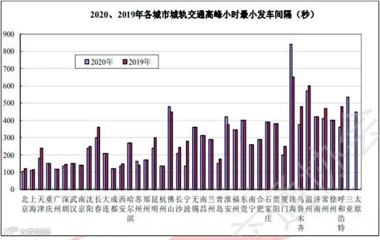 图14 2020、2019年各城市城轨交通高峰小时最小发车间隔