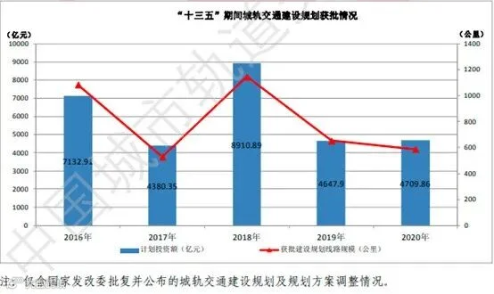 2020年已公布的获国家发改委批复的城轨交通建设规划批项目涉及新增线路长度共 587.9公里,新增计划投资共4709.9亿元。新增项目所涉及的城轨交通线路系统制式均为地铁。2020 年当年获批城轨交通建设规划(含规划调整)情况具体见表 9-1 和表 9-2。
