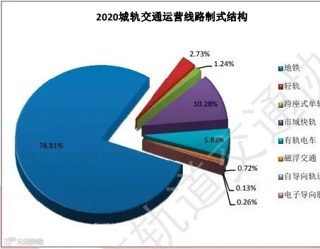根据团标《城市轨道交通分类》(T/CAMET 00001-2020)将城轨交通系统制式分为10类,分别为地铁系统、轻轨系统、市域快轨系统、磁浮交通系统、跨座式单轨系统、悬挂式单轨系统、自导向轨道系统、有轨电车系统、导轨式胶轮系统、电子导向胶轮系统。截至202年底,城轨交通运营线路中共有8种制式同时在运营。其中,地铁6280.8公里,占比78.8%;轻轨217.6公里,占比2.7%;跨座式单轨98.5公里,占比1.2%;市域快轨819.6公里,占比中国城市轨道交通协会710.2%;有轨电车464.6公里,占比5.8%;磁浮交通57.7公里,占比0.7%;自导向轨道系统10.2公里,占比0.1%,电子导向胶轮系统20.7公里,占比 0.2%。无悬挂式单轨和导轨式胶轮系统。2020 年各城市城轨交通运营线路制式结构见图 3。