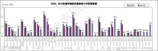 图12 2020、2019年各城市城轨交通高峰小时断面客流量