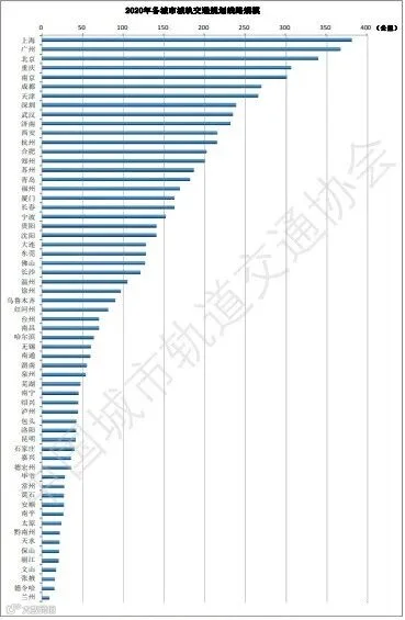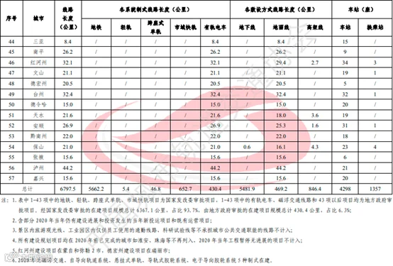 截至2020年底,中国大陆地区有57个城市(个别由地方政府批复项目未纳入统计)在建线路总规模6797.5公里(含个别2020年当年仍有建设进展和投资发生的已运营项目和2020当年新投运的项目),在建线路297条(段),共有31个城市在建线路为3条及以上,如再合并已运营线路,共有34个城市在建和运营线路超过3条。