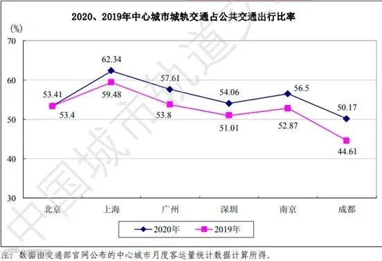 图6 2020、2019年中心城市城轨交通占公共交通出行比率