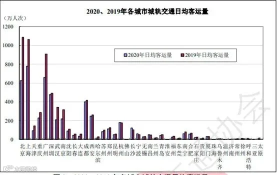 图8 2020、2019年各城市城轨交通日均客运量