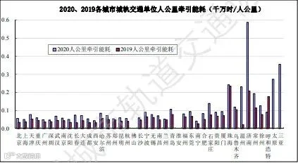图19 2020、2019年各城市城轨交通单位车公里牵引能耗