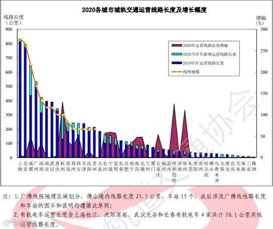 图1 2020年各城市城轨交通运营线路长度及增长幅度