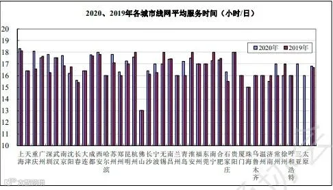 图15 2020、2019年各城市城轨交通线网平均运营服务时间