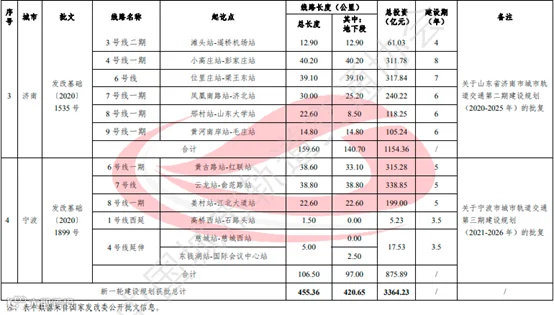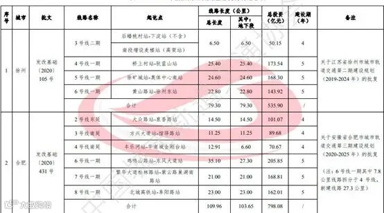 2020年,新一轮城轨交通建设规划获国家发改委批复并已公布的有徐州、合肥、济南、宁波4市。获批建设规划分别为徐州市城市轨道交通第二期建设规划(2019-2024年)、合肥市城市轨道交通第三期建设规划(2020-2025年)、济南市城市轨道交通第二期建设规(2020-2025年)和宁波市城市轨道交通第三期建设规划(2021-2026年)。4市新获批建设规划线路长度共计455.3公里,总投资共计3364.2亿元。