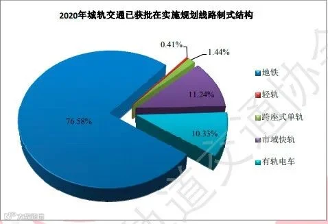 7085.5公里规划线路包含地铁、轻轨、跨座式单轨、市域快轨、有轨电车5种制式。其中,地铁5426.8公里,占比76.5%;轻轨28.8公里,占比0.41%;跨座式单轨101.9公里,占比1.4%;市域快轨796.1公里,占比11.2%;有轨电车731.9公里,占比10.3%;无磁浮交通、自导向轨道系统、悬挂式单轨、导轨式胶轮系统、电子导向胶轮系统线路规划。2020年度城轨交通已获批在实施规划的线路制式结构见图25。