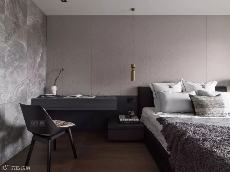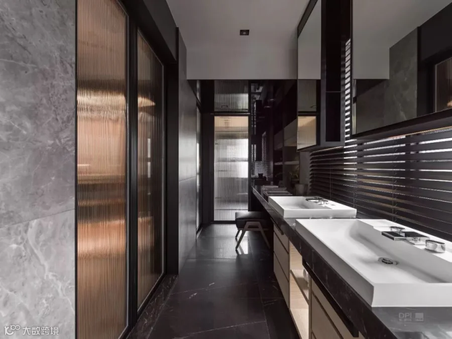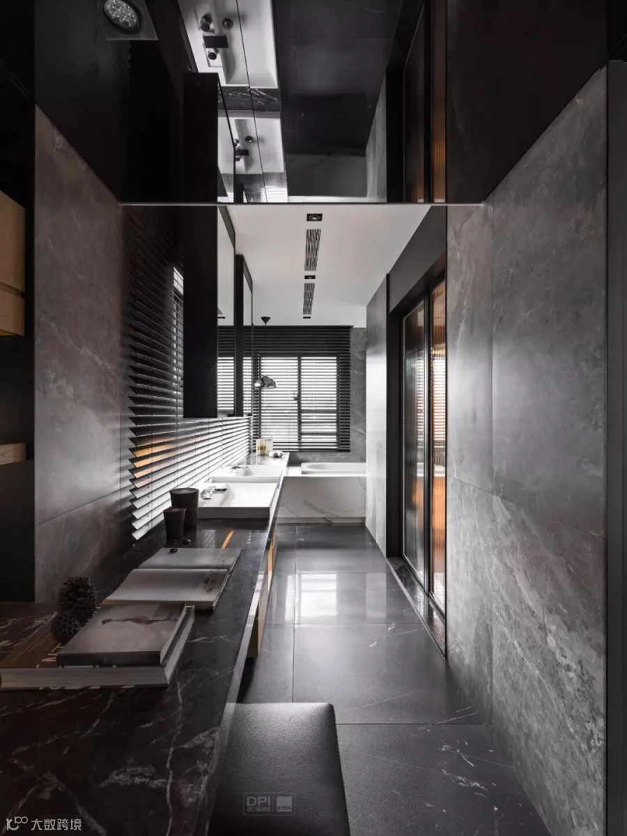 进到主卧室呈现一个比较特殊的转变,主浴室的格局完全打散,主浴室的配置非常特殊,尺度感跟空间的延续性非常好,有一个非常大的台面,并且将干与湿的使用场域彻底分开,所以空间的体验跟使用上是非常特别的感觉,主浴室也是本次设计重点中非常主要的环节。