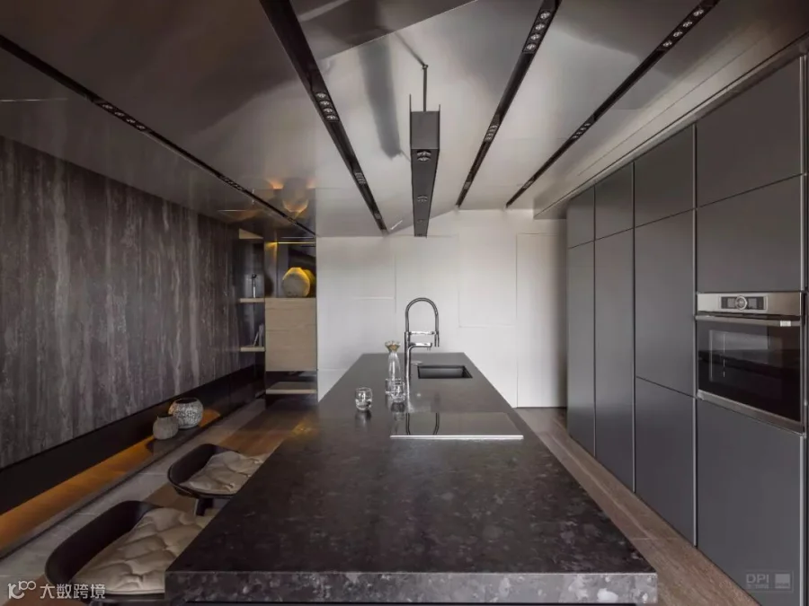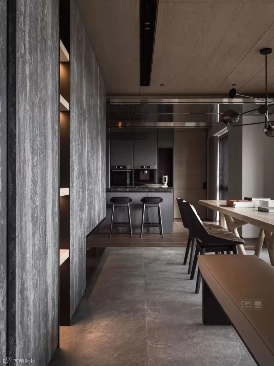 餐厅搭配了意大利REX瓷砖洞石系列作为墙面,做一个空间转折,形成全空间中的核心点,透过餐厅的天花及长餐桌的设定,让餐厅变成居住的重点。