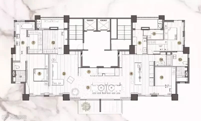 本案设计重点是重新安排了进入的空间顺序,首先会经过玄关再转折到一个比较狭长的空间,也就是长向餐桌的空间,这里有最大面积的采光,然而设计师把这个采光留给了餐厅,希望能够以餐厅做为生活重心的主轴心作发散,自轴心左边发散至客厅,右边至中岛、厨房(西厨、中厨),依照两边对称的架构,将空间的尺度敢向两侧延伸。