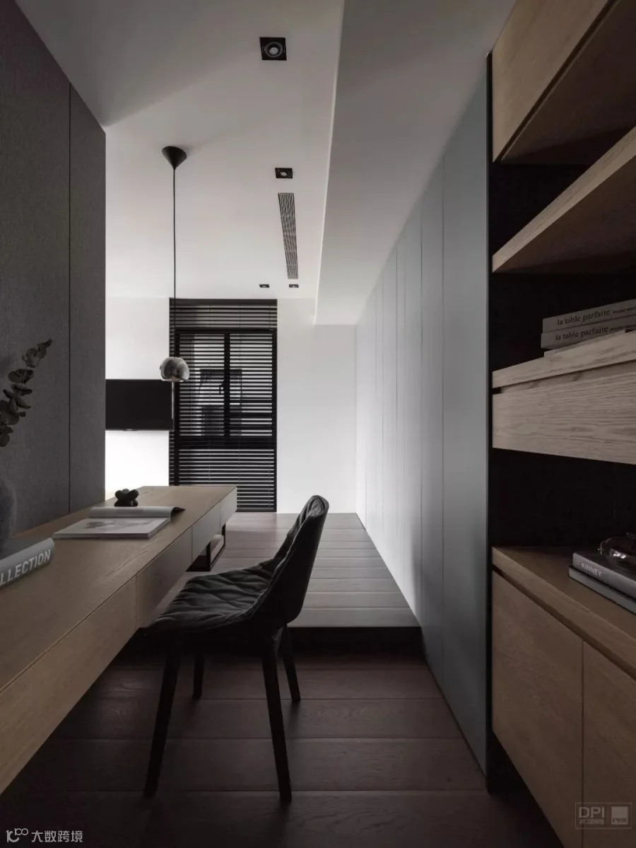 中岛、西厨、客房,中岛也是空间中非常重要的核心,家庭的生活重点从这里开始延伸到餐厅,变成重要的家庭聚会的场所,透过空间的连结,进到客房,客房高低差,利用书桌书柜的延续,颠覆传统房间的概念,形成了非常有趣的空间体验。