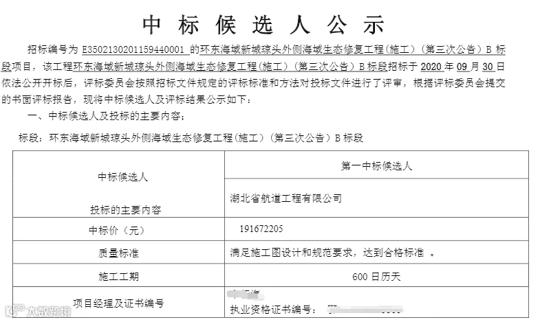 根据厦门市公共资源交易中心网公示:10月14日开始公示的环东海域新城琼头外侧海域生态修复工程(施工)(第三次公告)施工招标,其A标段招标控制价为48332万元,而中标单位的中标价仅为485万元,其B标段招标控制价为62638万元,中标单位的中标价为19167万元。