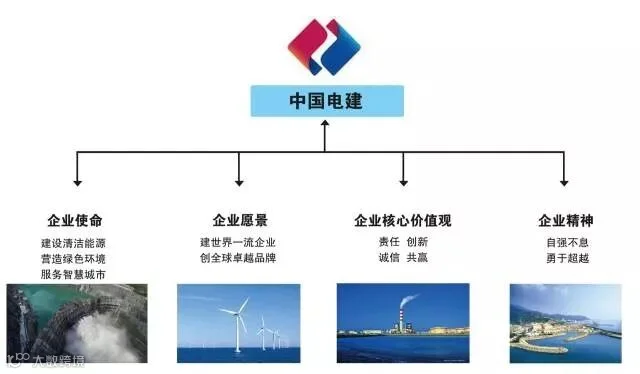 图形中间的白色图形形似闪电,不但体现了中国电建的行业属性,也代表着速度和效率、生机与活力,并象征企业具有超前发展的实力和理念;又如同一条奔腾的河流,它体现的是设计建造运营一体化的中国电建,它呈现的是以建设绿色能源、建立绿色产业,推动可循环、可持续健康发展的中国电建,它展现的是注重开放沟通,对内员工融洽合作、对外与国际接轨的中国电建,寓意着中国电建“争做世界一流”的愿景。