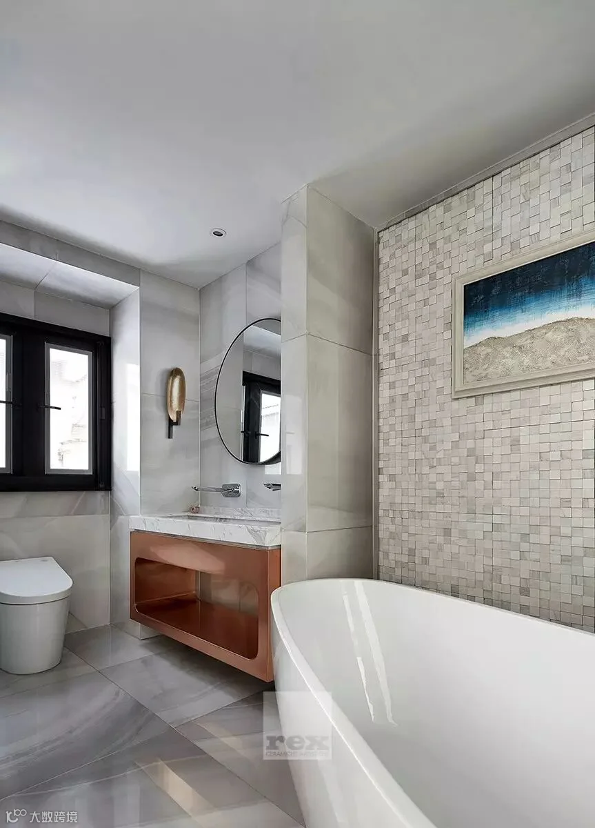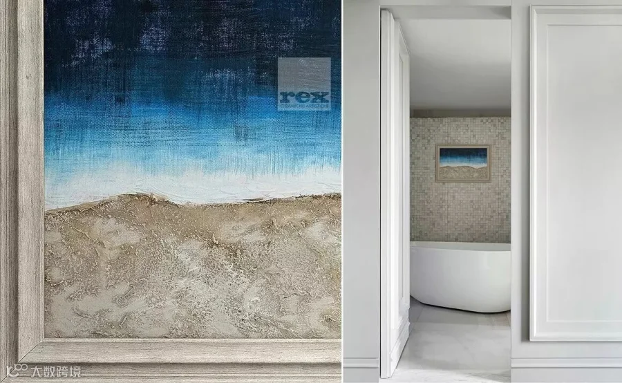 开门后,独立浴缸作为艺术品般呈现于主卫生间的端景处,马赛克墙面配合沙滩油画,营造一种沐浴阳光的氛围,订制安装的洗手台由设计师配合整体风格创意设计。