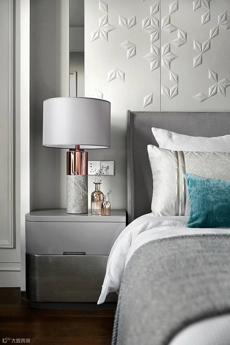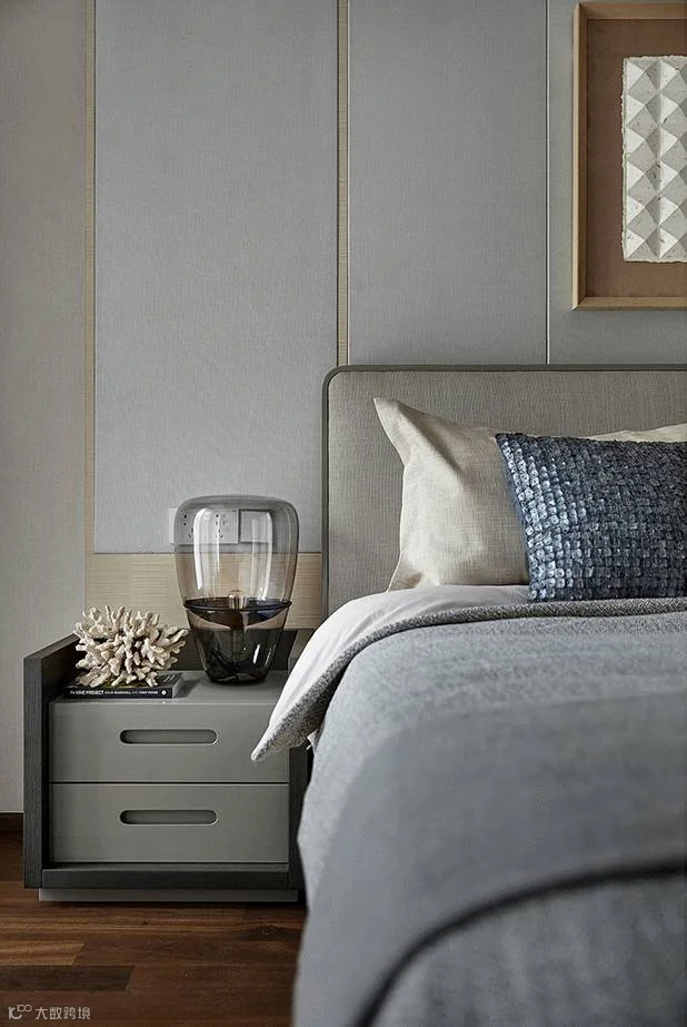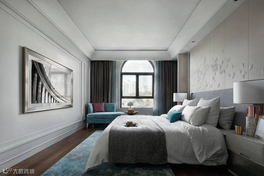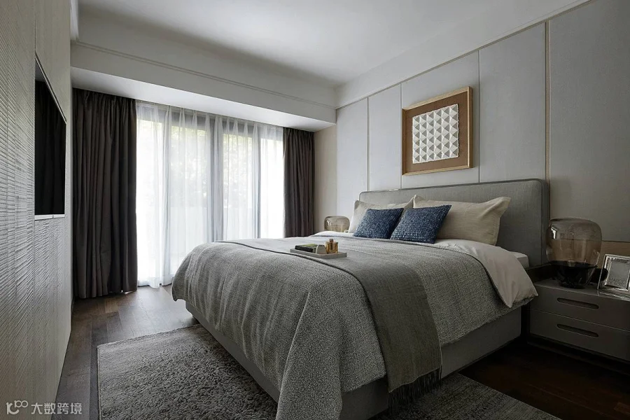 主卧房选择优雅平静的灰白色调作为空间的主调性,香槟金色的东南亚手工打造装饰盒与饰品体现精致感,蓝色的家具及地毯让整体空间多一份活跃。