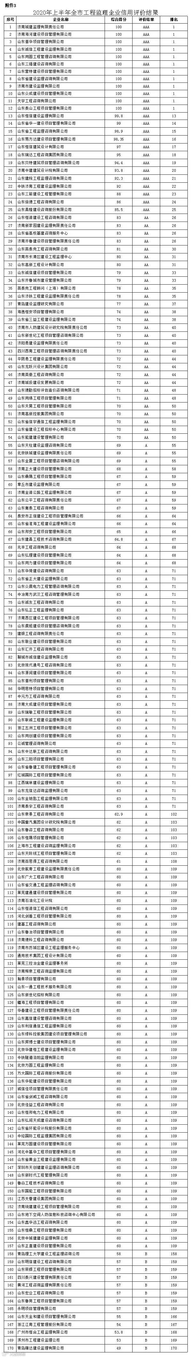 为进一步规范我市建筑市场秩序,推进建筑市场主体信用体系建设,根据《济南市建筑市场主体信用评价管理办法》(济建发〔2020〕2号)、《<济南市建筑市场主体信用评价管理办法>评分表》(济建发〔2020〕4号)和《<济南市建筑市场主体信用评价管理办法>评分表补充通知》(济建建管字〔2020〕64号)要求,我局建筑市场主体信用管理办公室对2020年上半年全市建筑施工企业、工程监理企业、造价咨询企业、质量检测机构和预拌混凝土企业信用信息进行了采集、录入、审核、计分、评价,公示期已满,现予以公布。