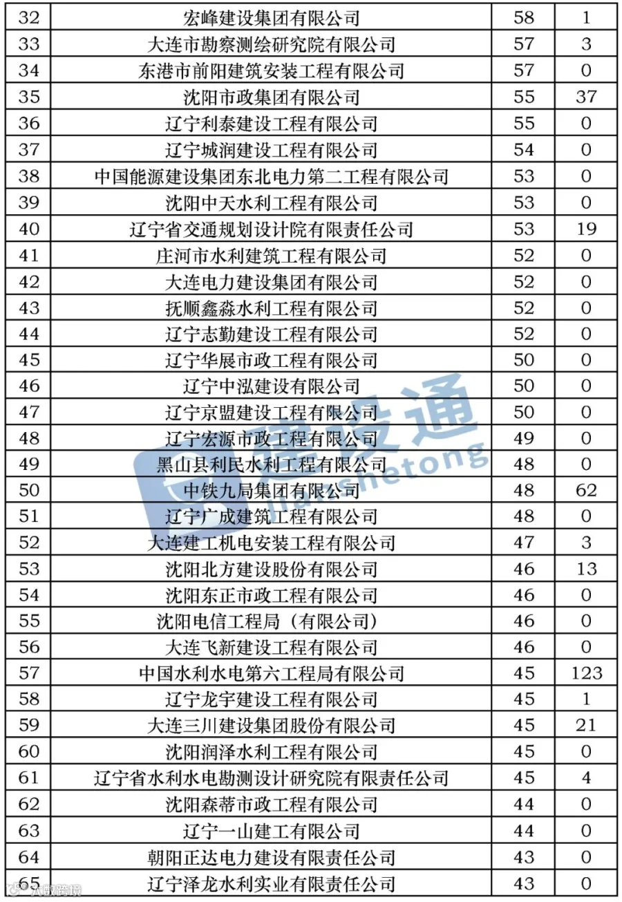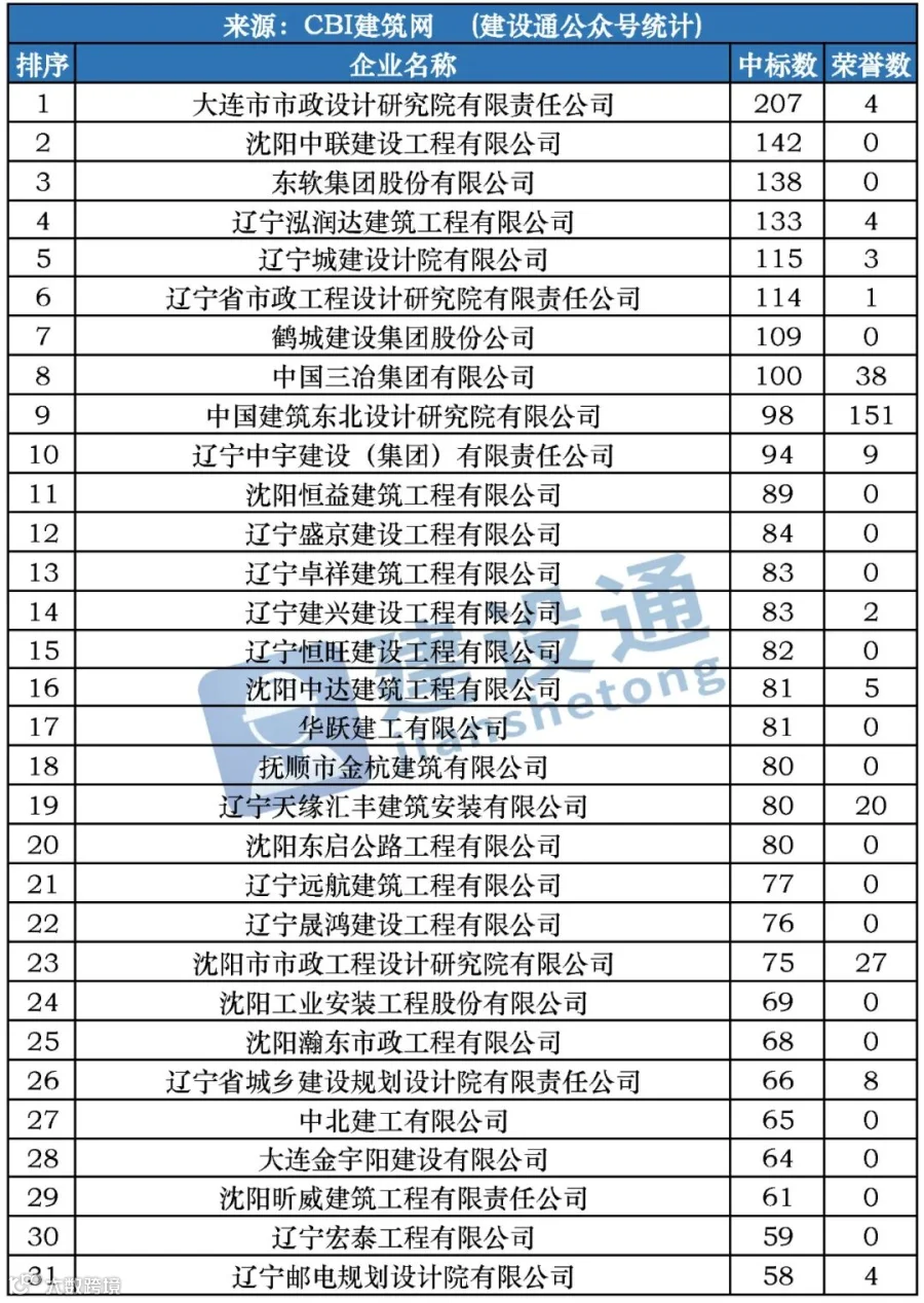 CBI建筑网综合报道:在2020年,辽宁建筑施工企业中标数量达29952项,同比(与去年同期)上升27.04%。其中,大连市市政设计研究院有限责任公司、沈阳中联建设工程有限公司、东软集团股份有限公司分列中标数量排行榜前三位。