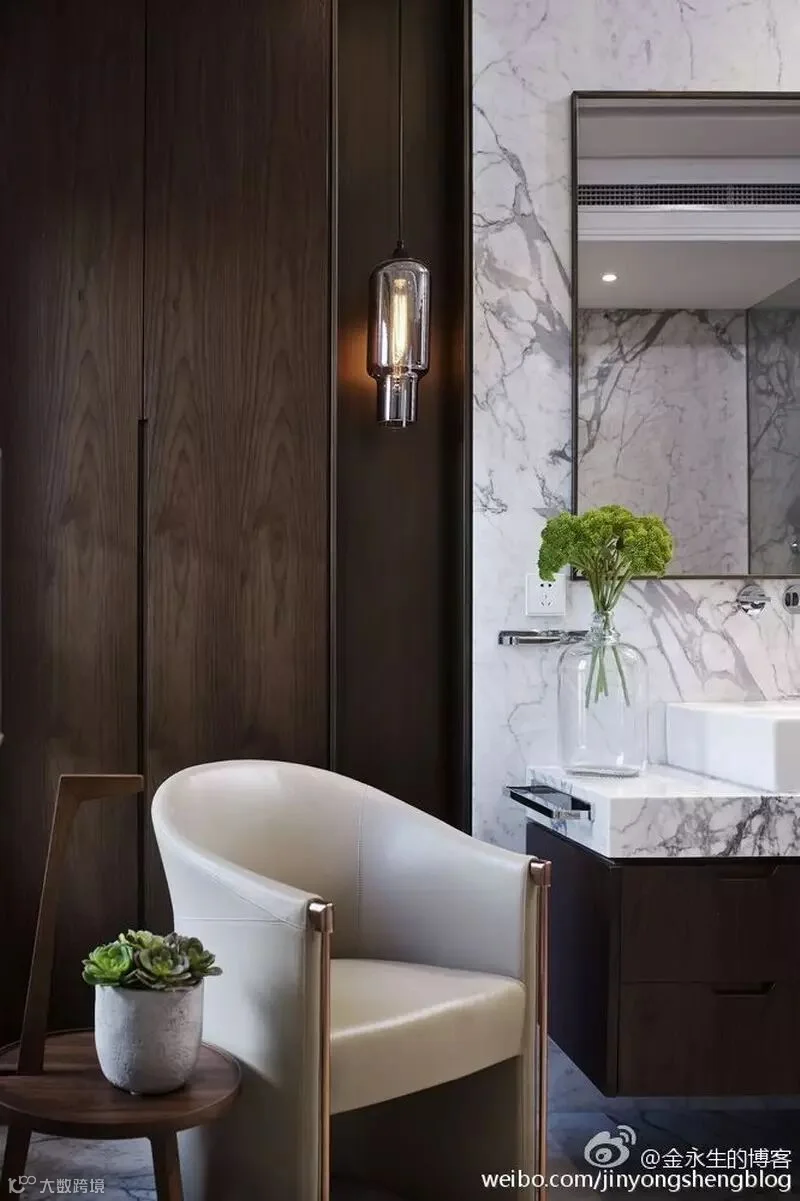 9.鱼肚白石材和胡桃木色的搭配使得原本简单的空间变的极其有品质。