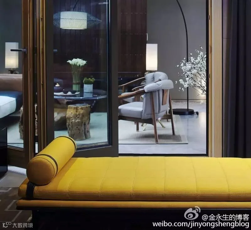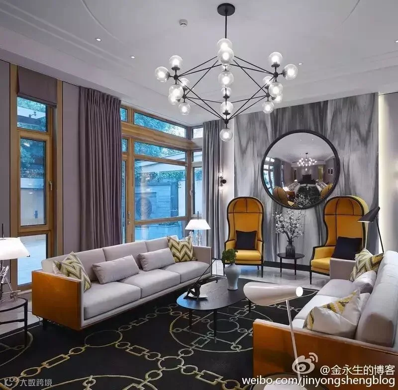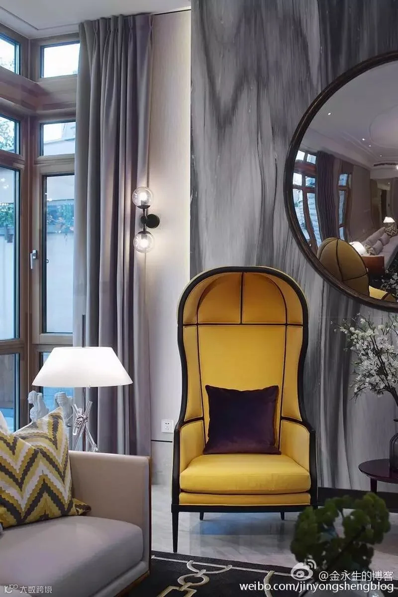 5.会客厅在大面积淡雅沉稳的素色设计中,巧妙简单的搭配少许的黄色,使空间变的更加生动和创意。