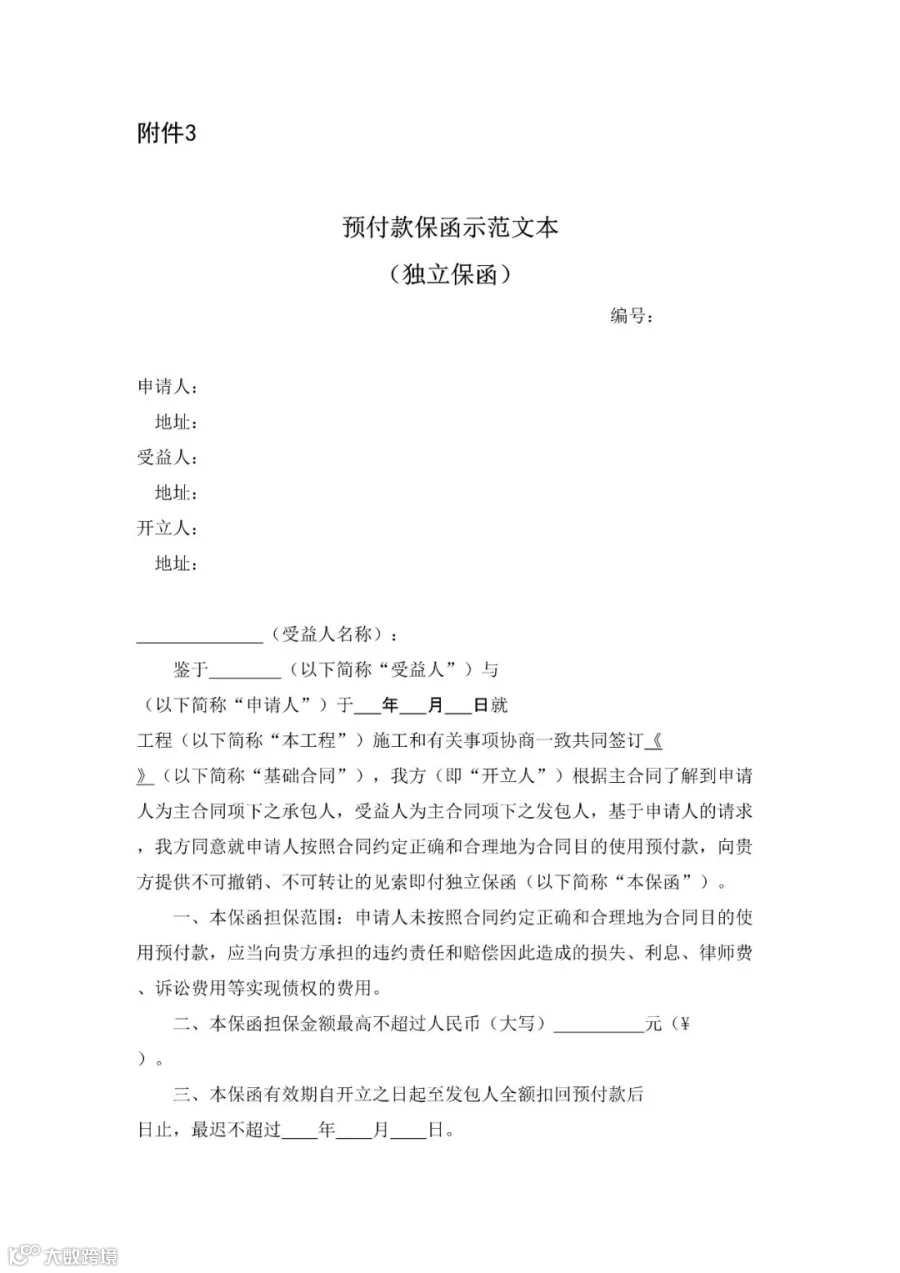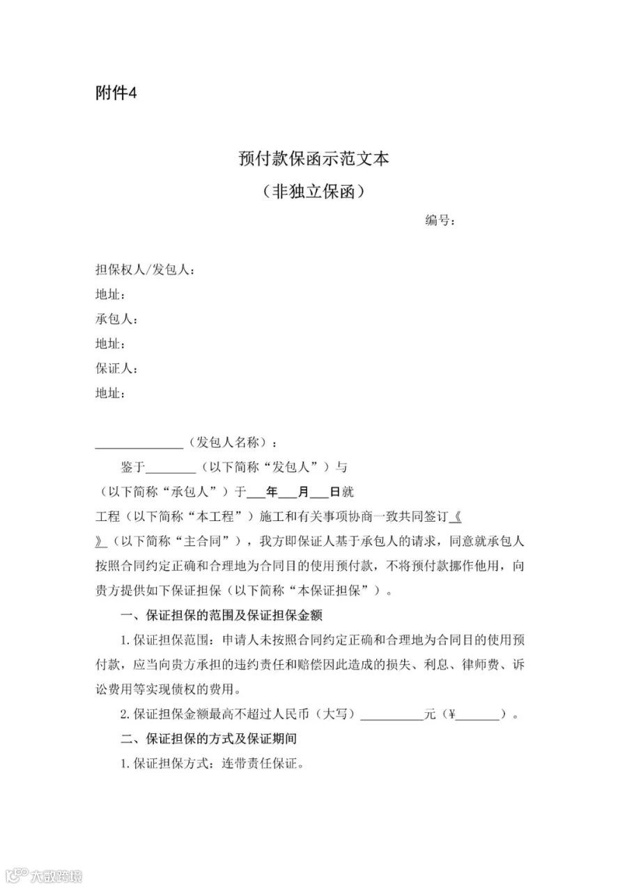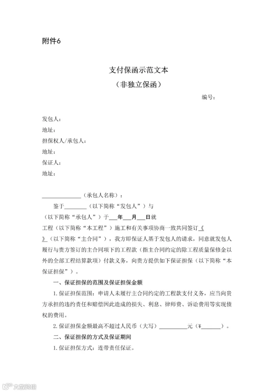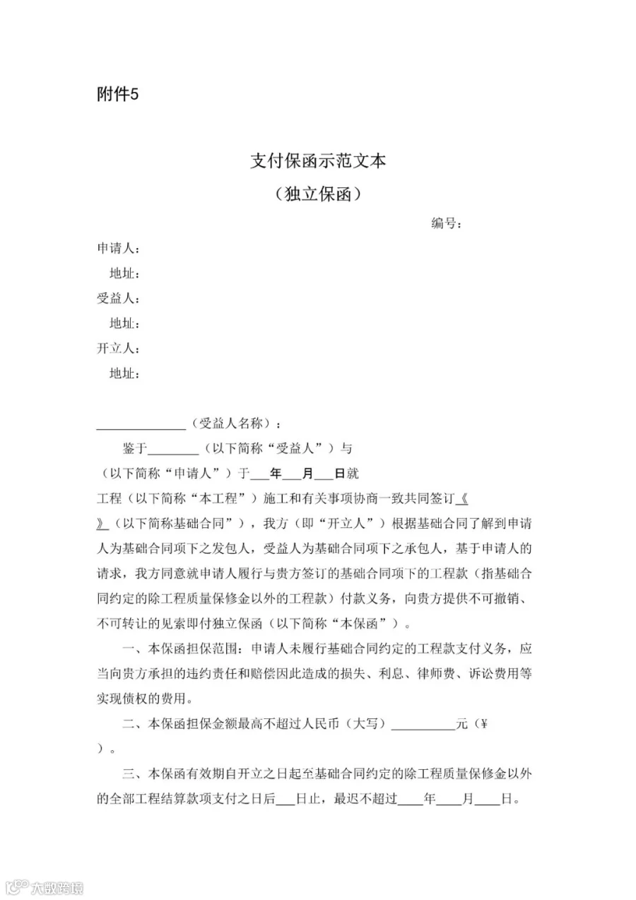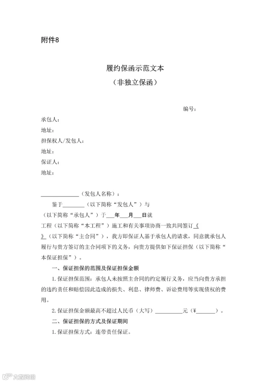 住建部发布的《工程保函示范文本》包含投标保函示范文本、预付款保函示范文本、支付保函示范文本、履约保函示范文本等8个文本,文末附电子版文本获取方式。