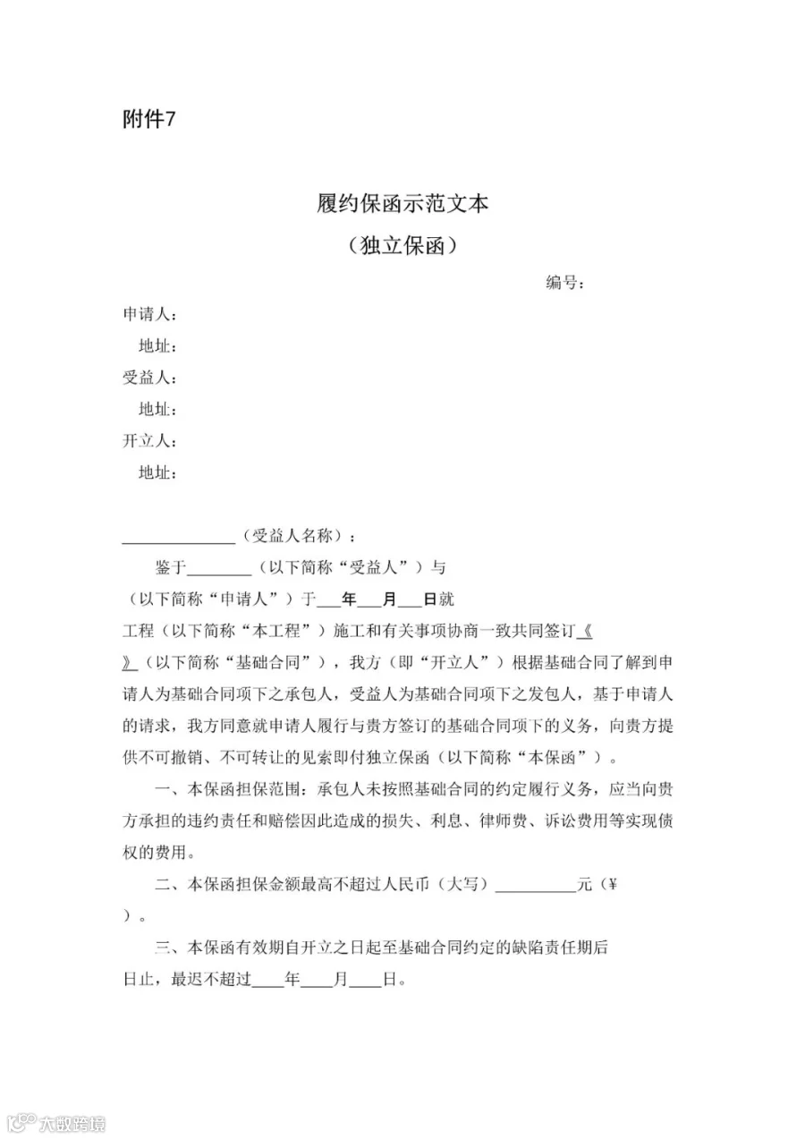 为进一步推进工程建设领域担保制度建设,促进建筑市场健康发展,我部制定了《工程保函示范文本》,现印发给你们,自2021年3月1日起执行。原《工程担保合同示范文本(试行)》(建市〔2005〕74号)同时废止。