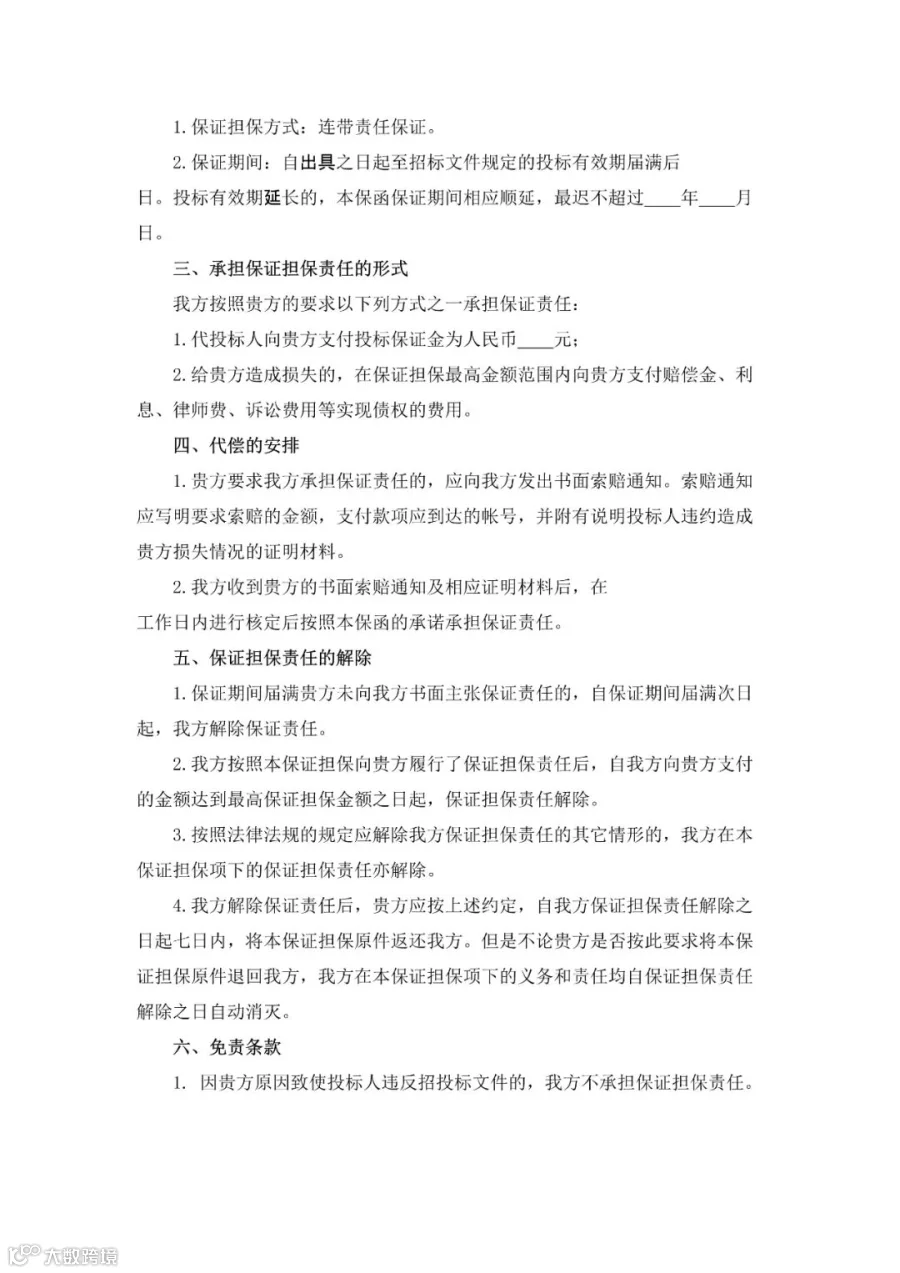 一、我方理解根据招标条件,投标人必须提交一份投标保函(以下简称“本保函”),以担保投标人诚信履行其在上述基础交易中承担的投标人义务。鉴此,应申请人要求,我方在此同意向贵方出具此投标保函,本保函担保金额最高不超过人民币(大写) 元(¥ )。