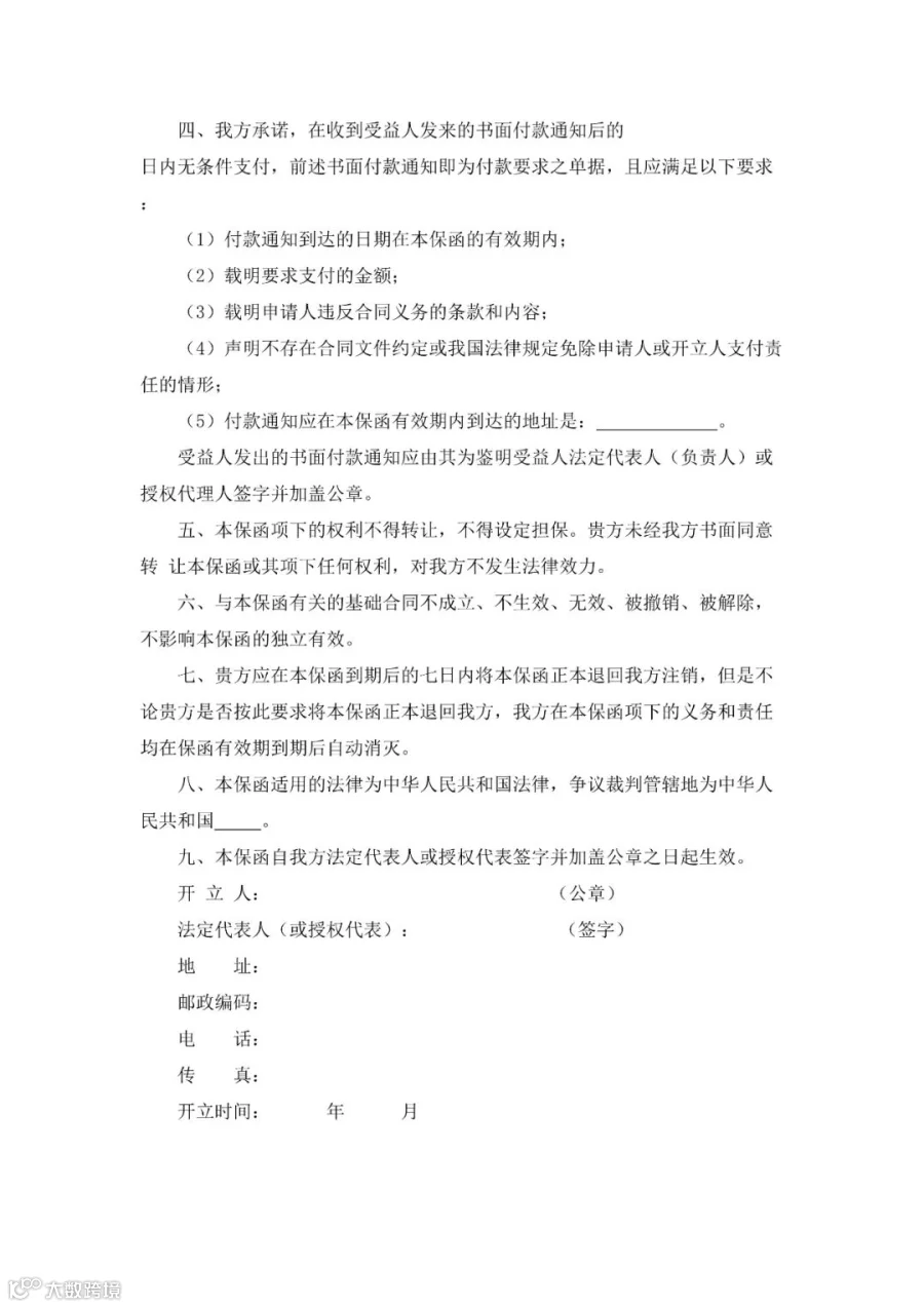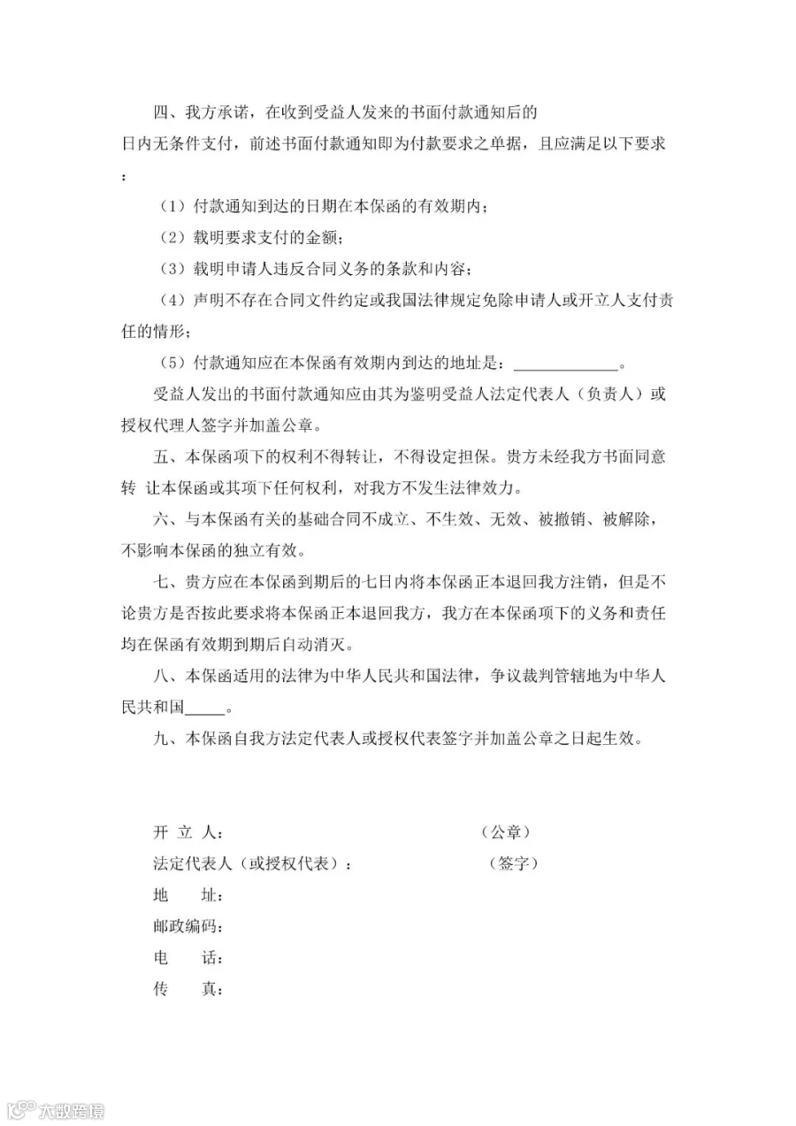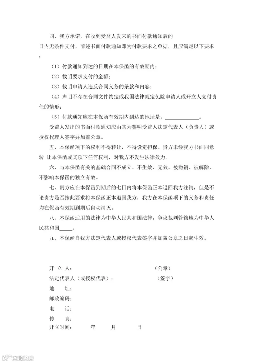 四、我方承诺,在收到受益人发来的书面付款通知后的 日内无条件支付,前述书面付款通知即为付款要求之单据,且应满足以下要求: