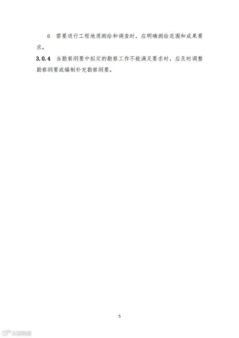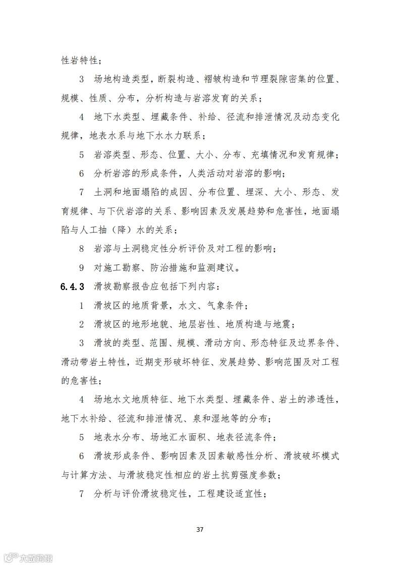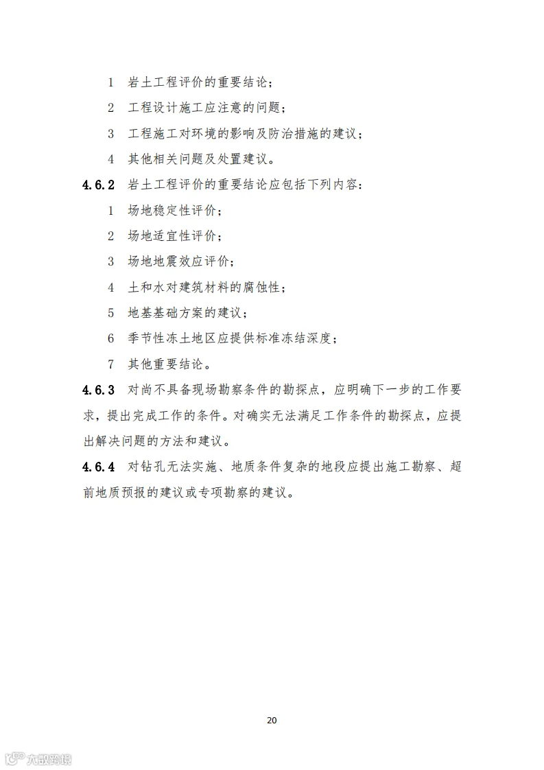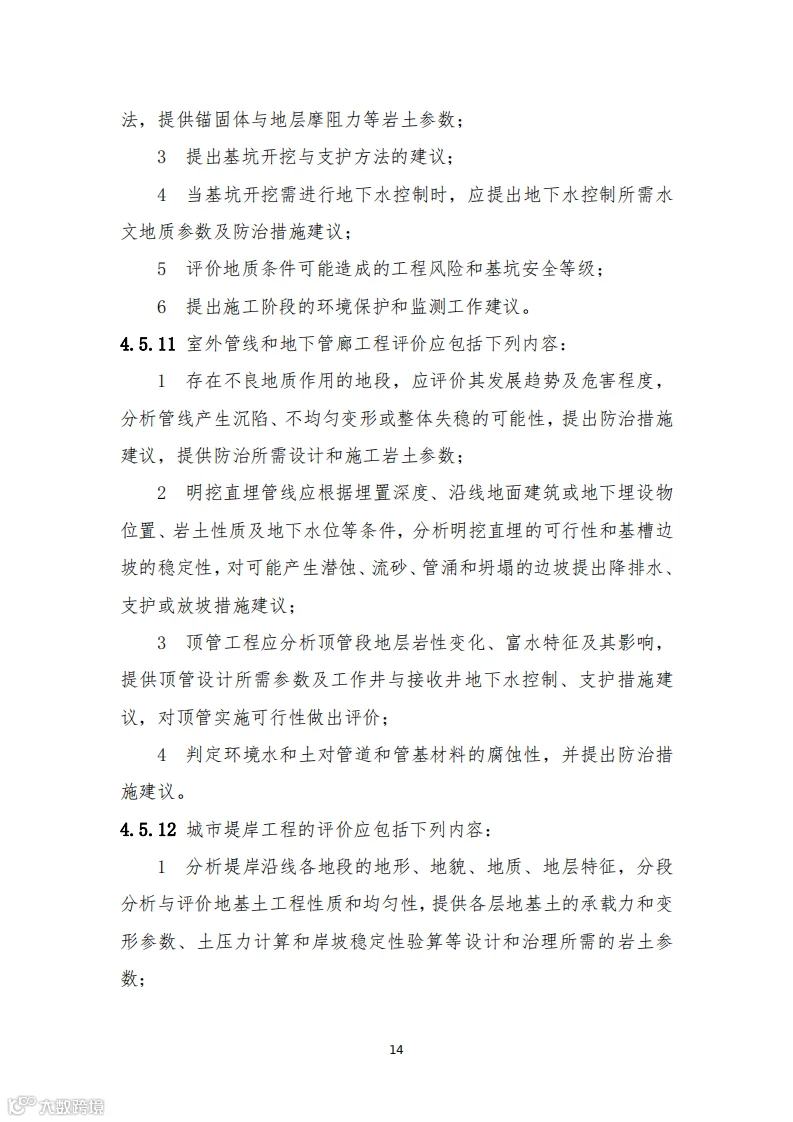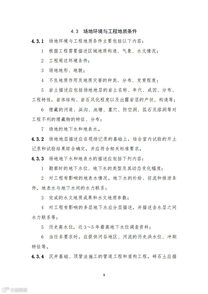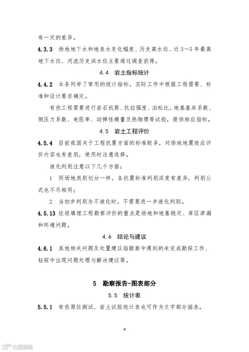 根据法规规章要求进行相应调整。如《危险性较大的分部分项工程安全管理规定》(住房和城乡建设部令第37号)自2018年6月1日起施行,其第六条规定:“勘察单位应当根据工程实际及工程周边环境资料,在勘察文件中说明地质条件可能造成的工程风险。”本次修订在4.5.1条中予以体现。