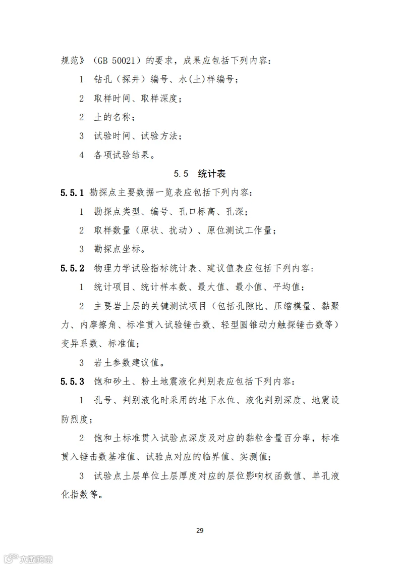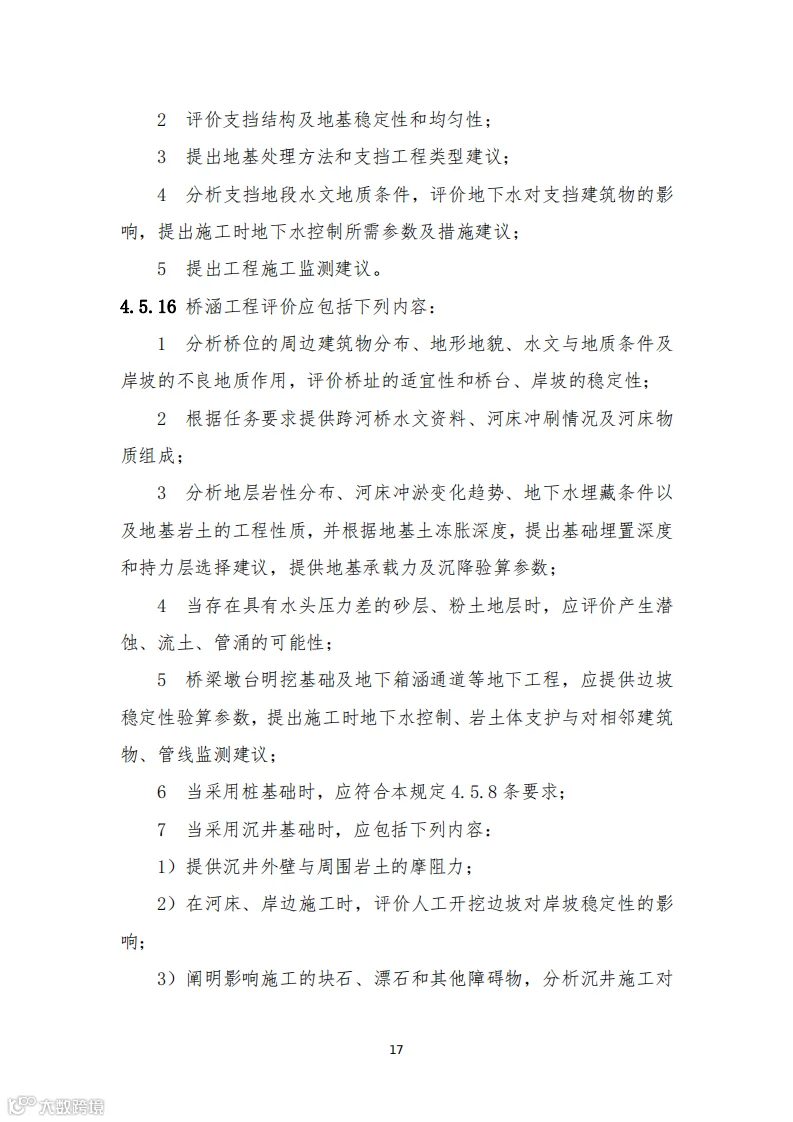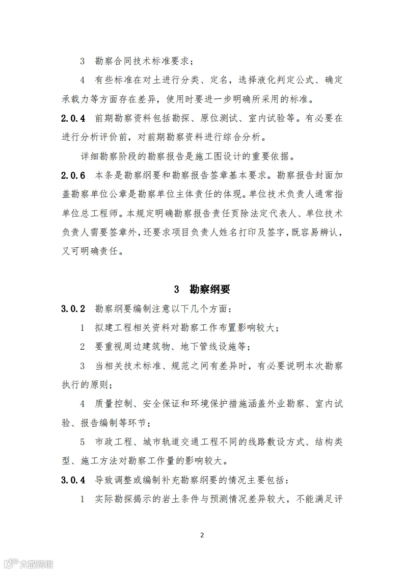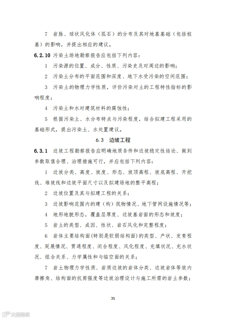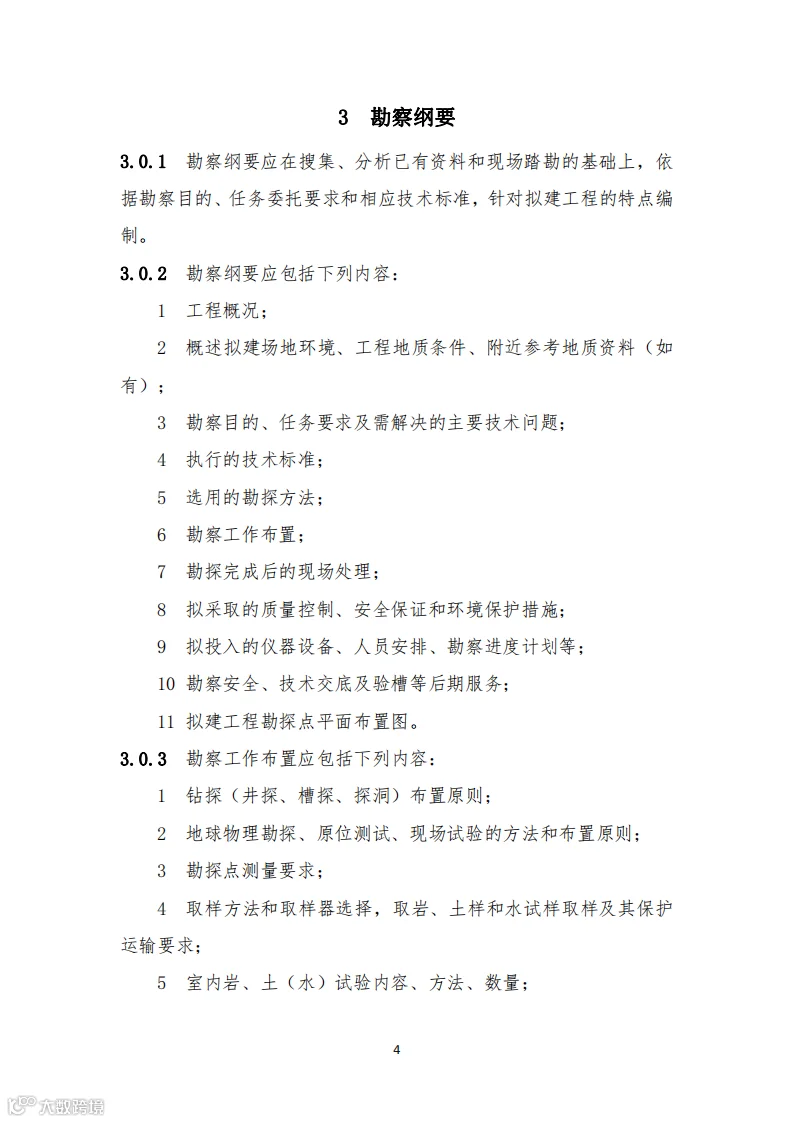 根据法规规章要求进行相应调整。如《危险性较大的分部分项工程安全管理规定》(住房和城乡建设部令第37号)自2018年6月1日起施行,其第六条规定:“勘察单位应当根据工程实际及工程周边环境资料,在勘察文件中说明地质条件可能造成的工程风险。”本次修订在4.5.1条中予以体现。