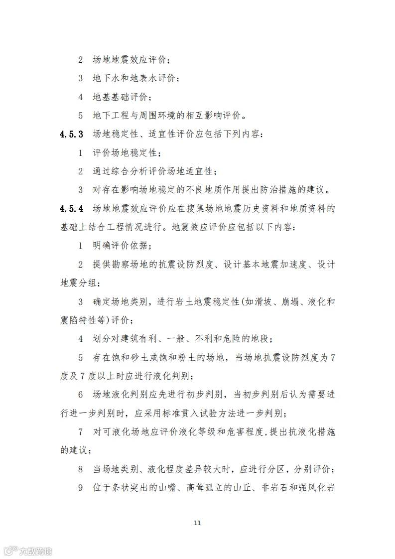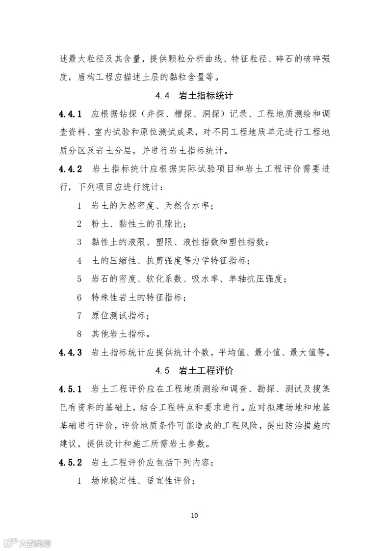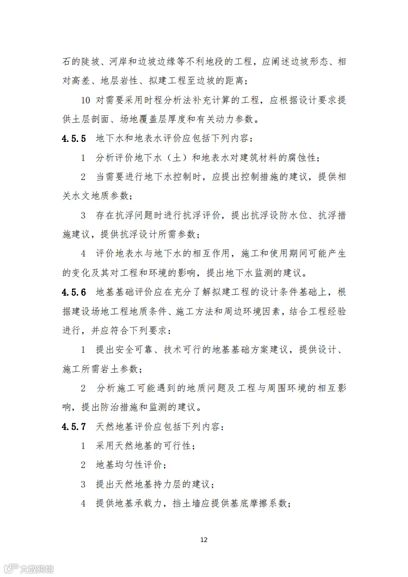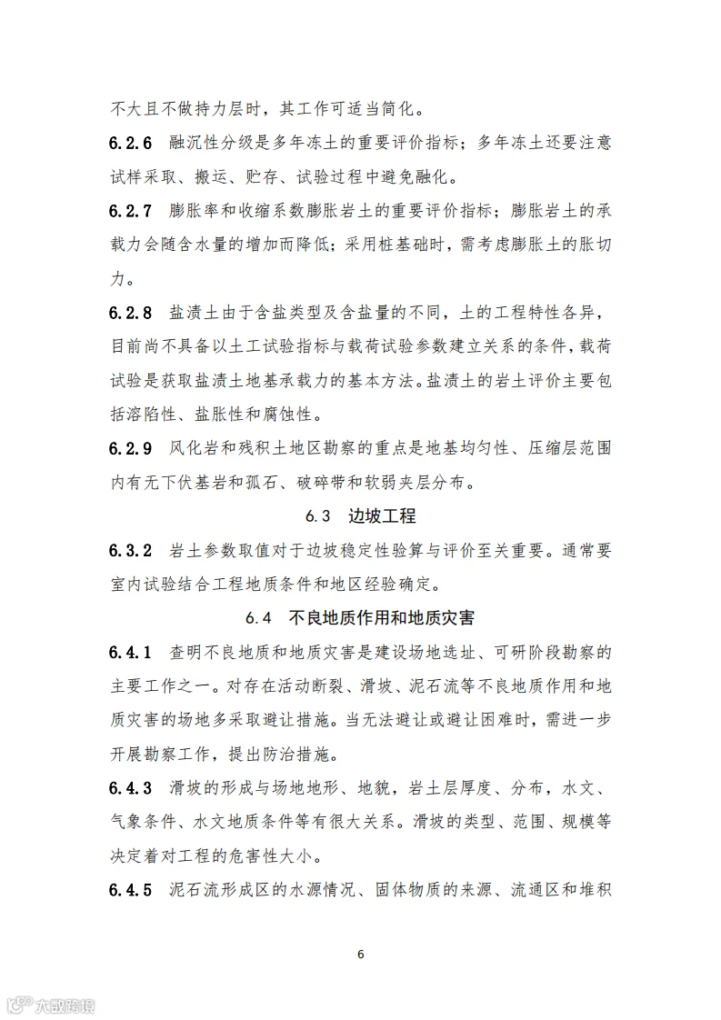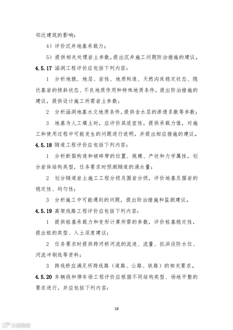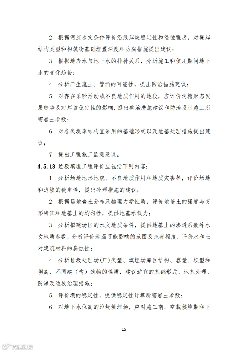 根据法规规章要求进行相应调整。如《危险性较大的分部分项工程安全管理规定》(住房和城乡建设部令第37号)自2018年6月1日起施行,其第六条规定:“勘察单位应当根据工程实际及工程周边环境资料,在勘察文件中说明地质条件可能造成的工程风险。”本次修订在4.5.1条中予以体现。