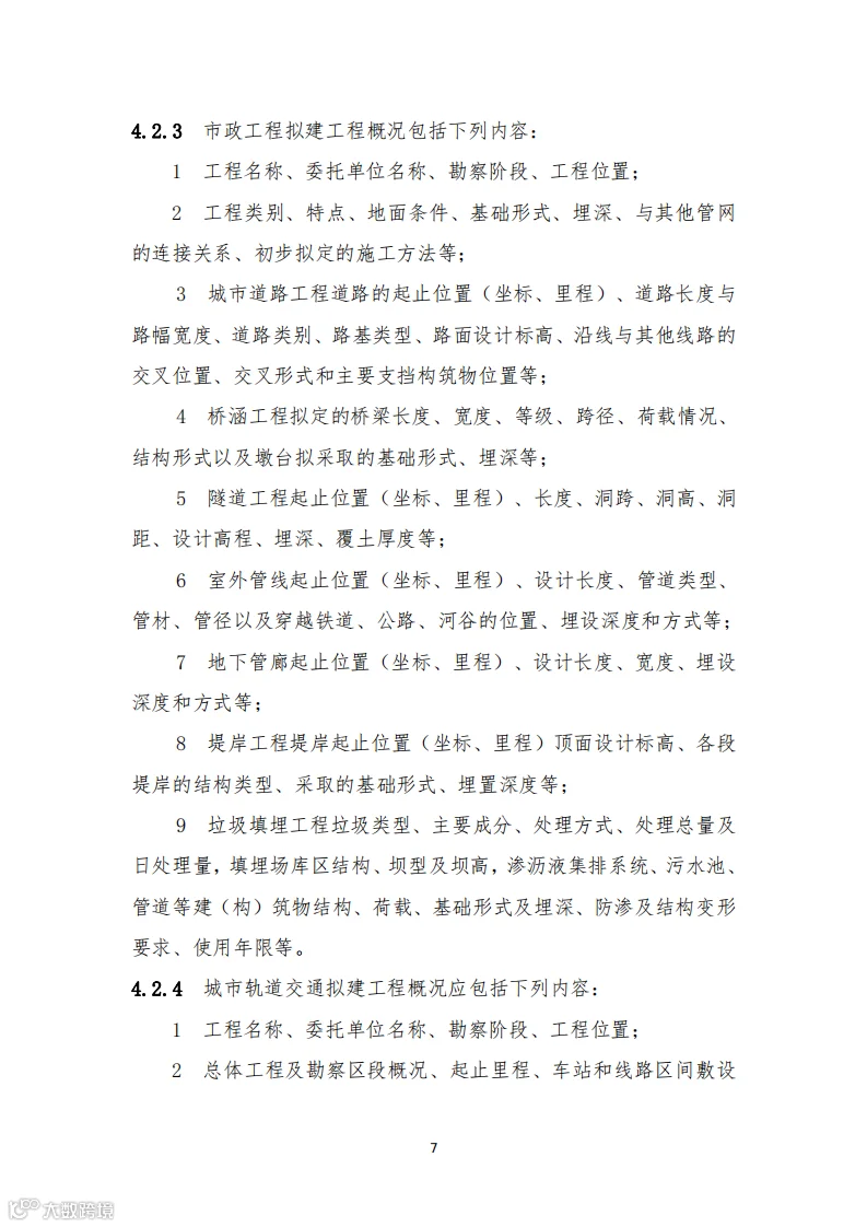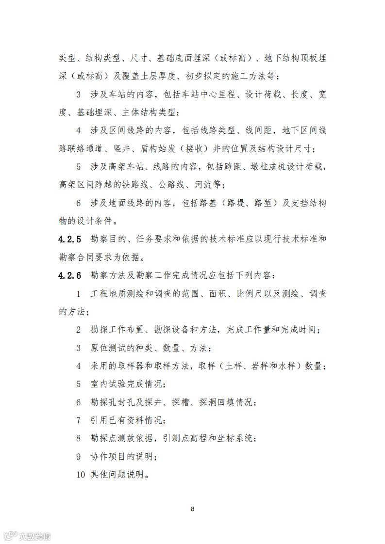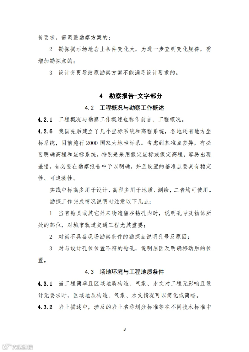 根据工程勘察标准进行相应调整。如考虑到我国已实施2000大地坐标系统,实际各地仍有采用不同坐标系统情况,为避免差错,本规定在4.2.6条第8款增加了引测点的高程和坐标系统要求。同时根据《城市轨道交通岩土工程勘察规范》GB50307-2012对第4.5.14条城市轨道交通工程的分析评价要求进行了完善